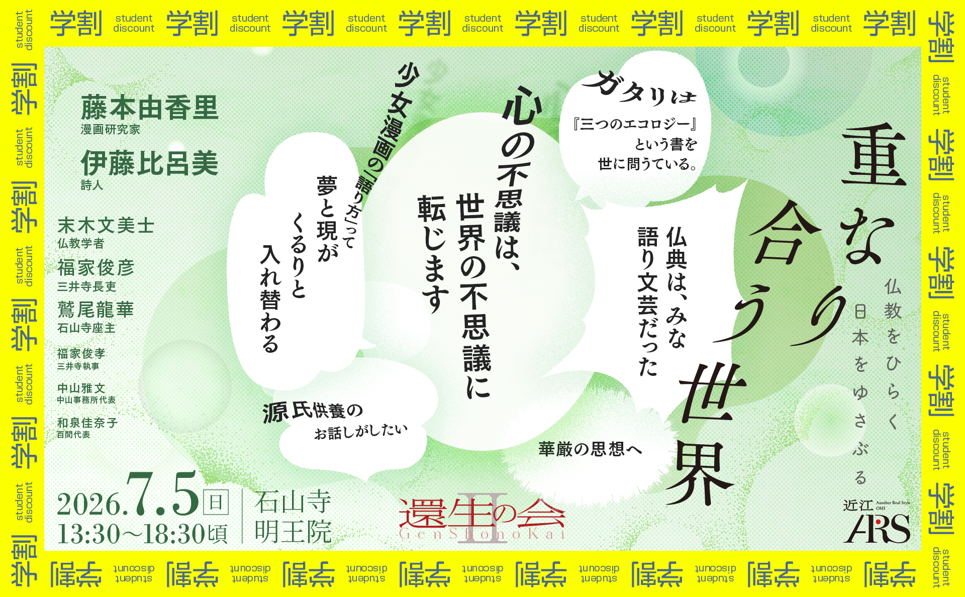 誰かの心の揺らぎは、思っているより遠くまで届いているのかもしれません。 私たちの心は、自分の内側にあるようでいて、どこかで他者や世界とつながっています。 そのつながりは、網のように重なり合いながら広がっている。 けれど、ふだんそれは見えません。 日々、働き、暮らすなかで見えている世界は、その一部にすぎないとしたら、その外側にある関係性を、どう捉えることができるのか。 今回の「還生の会」では、その感覚にあらためて目を向け、私たちの認識を超えて、遠くのどこかと重なり合う世界について考えます。 仏教学者の末木文美士さんは、「仏は心の中におわす」のに、同時に外なる「他者」でもあるという不思議から出発し、「心」と「世界」の関係をひもときます。 その鍵となるのが、華厳の大成者である法蔵が表現した「重々無尽」という世界観です。 三井寺長吏の福家俊彦さんは、仏教が本来持っている広がりに目を向けます。 自然と文化、感性と理性、言葉や芸術といった領域を横断しながら、私たちの世界の見方そのものを問い直していきます。 そして今回、特別ゲストとしてお迎えするのは、漫画研究家の藤本由香里さん、詩人の伊藤比呂美さんです。 藤本由香里さんは少女漫画のなかにひそむ「重なり合う世界」を、伊藤比呂美さんは歌や語りの底にある「仏教」を解きほぐしてくださいます。 初夏のやわらかい光につつまれる頃、少女漫画や語り文芸、そして仏教が、紫式部ゆかりの「石山寺」で出会います。 見えないものどうしがひびき合い、重なり合う世界へ。 思考の枠をひらく時間を、ぜひご一緒ください。 <b>近江ARS【還生の会Ⅱ-3】「重なり合う世界」(現地参加)の詳細</b> ◎日時 令和8年7月5日(日)13時30分〜18時30分頃(受付開始13時) ◎テーマ 「重なり合う世界」 ◎場所 大本山石山寺 明王院 〒520-0861 滋賀県大津市石山寺1-1-1 ◎出演 縁主:藤本由香里 (漫画研究家) 縁主:伊藤比呂美 (詩人) 紫座:鷲尾龍華 (石山寺座主) 還生灯主:末木文美士 (仏教学者) 還生風主:福家俊彦 (三井寺長吏) 茶観:福家俊孝 (三井寺執事) 影守:中山雅文 (近江ARSチェアマン) 結象:和泉佳奈子 (百間代表) ◎定員 約50名 ◎参加費 現地参加費 13,000円(税込) *HYAKKEN MARKETにて事前支払いをお願いします ◎主催 近江ARS(アルス) <a href="https://arscombinatoria.jp/omi">https://arscombinatoria.jp/omi</a> ◎お問合せ 近江ARS本部 滋賀県大津市栗林町3-1中山事務所内 中山雅文 近江ARS総局 東京都千代田区九段南2-2-8松岡九段ビル百間内 和泉佳奈子 <a href="mailto:omi@arscombinatoria.jp">omi@arscombinatoria.jp</a> (近江 ARS 担当 中山・和泉) ◎プロデュース 百間 <還生の会>とは? 「還生の会」という名前は、近江ARSの創設者・松岡正剛が命名しました。バーチャルに行きながら、もう一度リアルに戻って往生するという意味が込められています。 ご感想やご意見ほか、近江ARSのイベントなどのご案内をご要望の方は、本プロジェクトの公式サイトの「CONTACT」からご連絡いただけますようお願いいたします。 <a href="https://arscombinatoria.jp/omi">https://arscombinatoria.jp/omi</a>